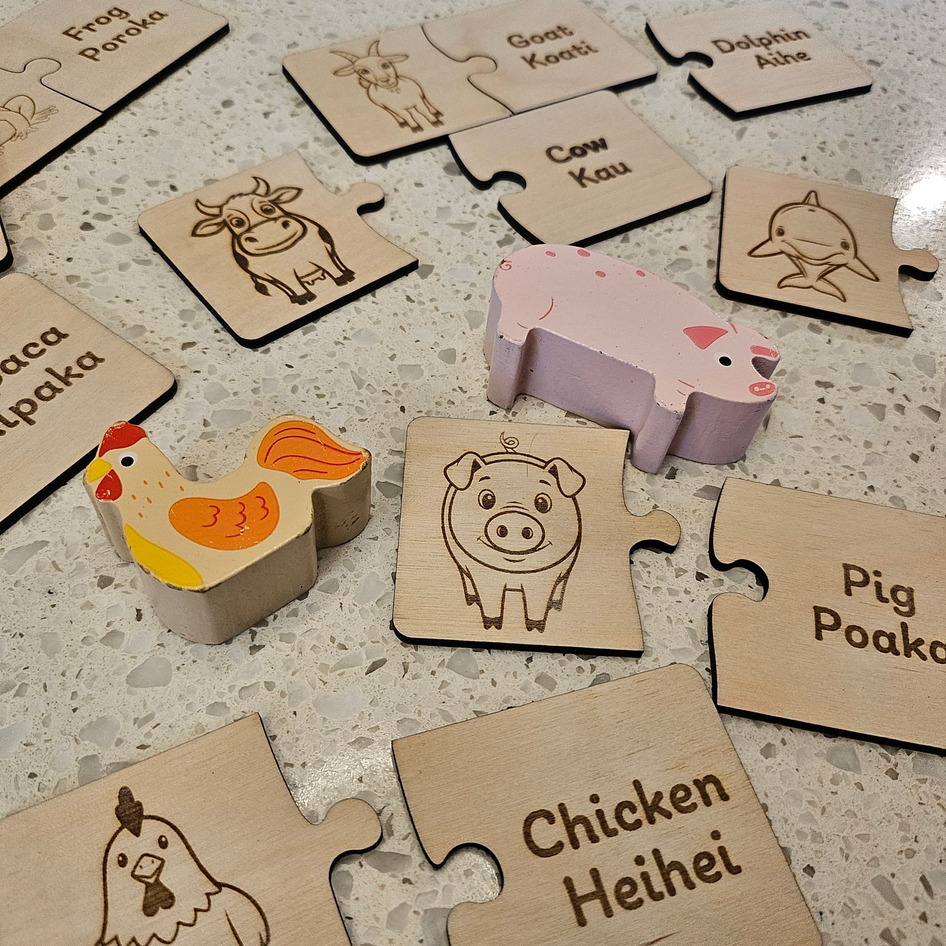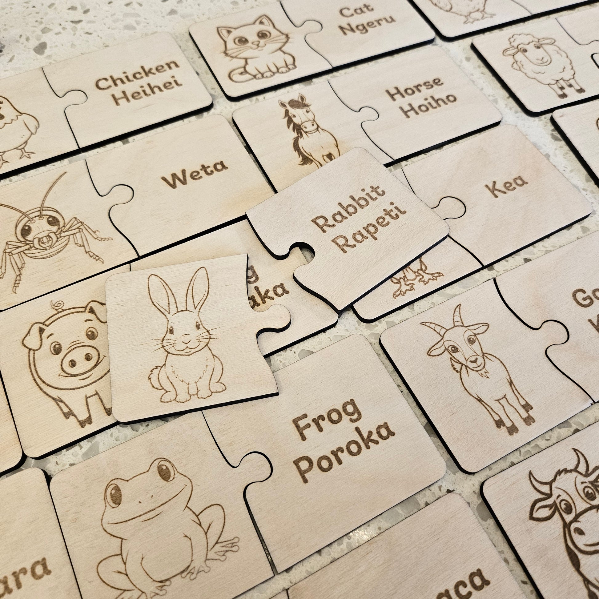 Discover the joy of learning with these playful wooden matching tiles! Each set features 20 beautifully laser-engraved birch wood tiles, pairing charming animal pictures with their names in both English and Te Reo Māori. Explore New Zealand’s unique wildlife, including the iconic Kiwi, while building language skills and memory. Perfect for curious minds and little hands eager to match, learn, and have fun!