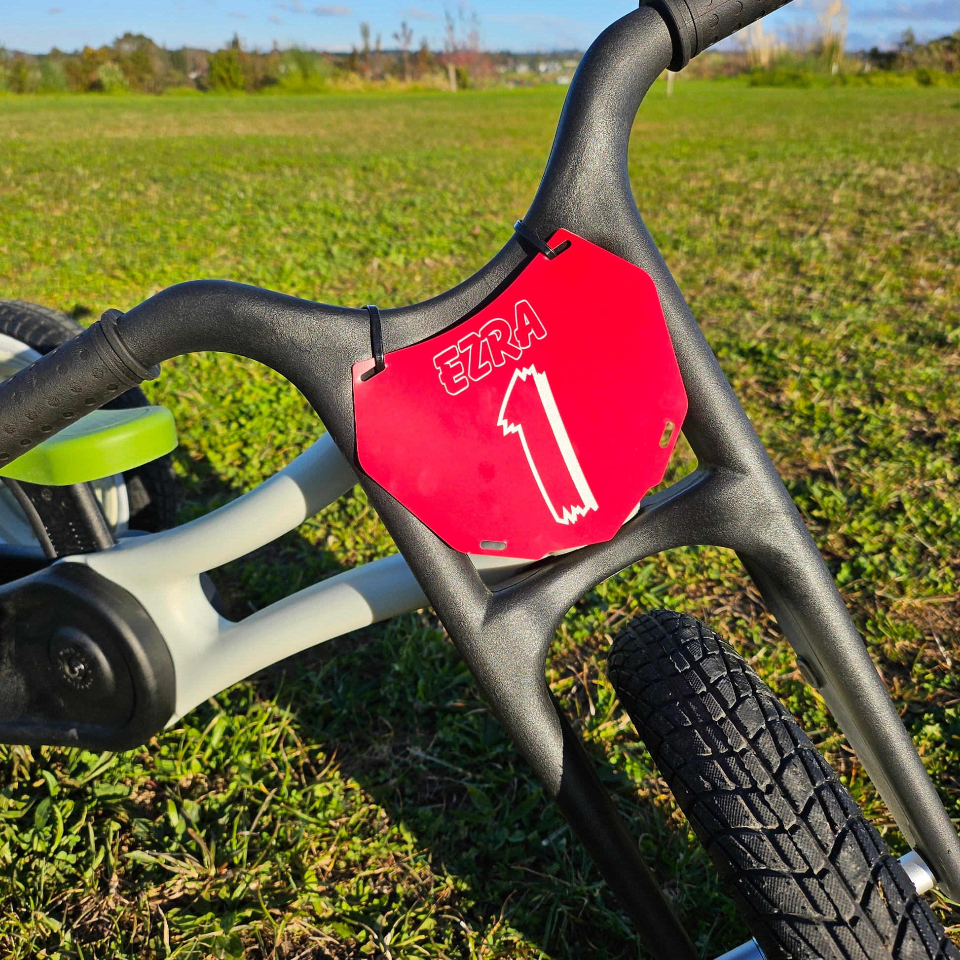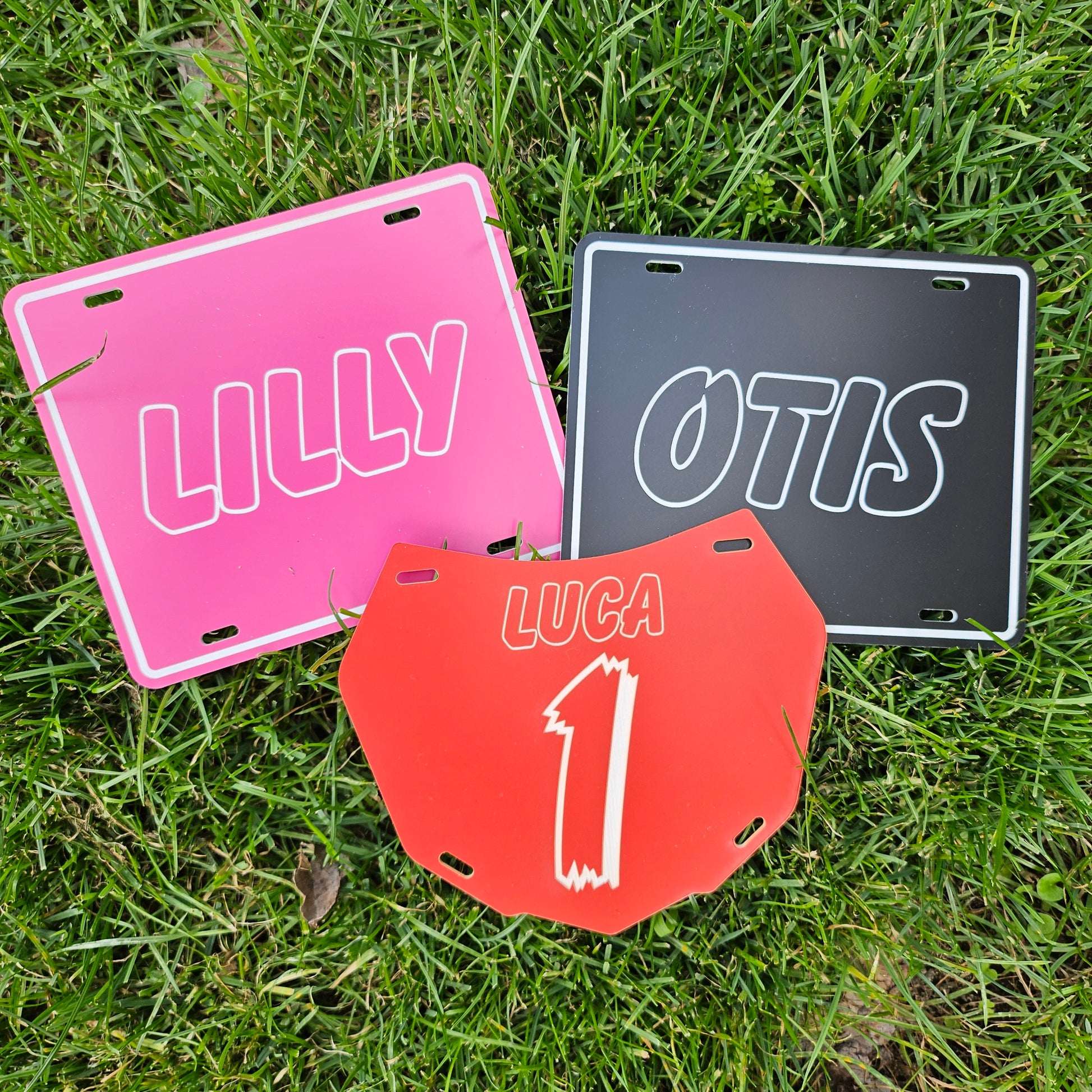 Personalise with any name, and for the motocross plate, any number you like as well.