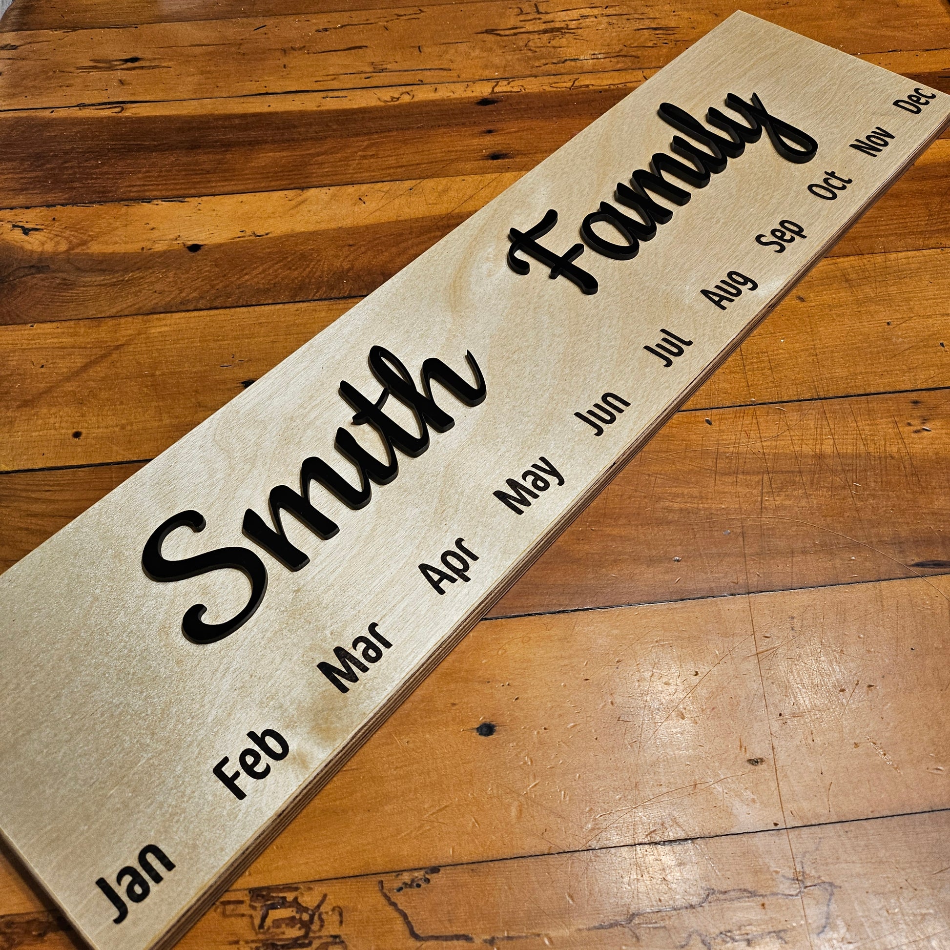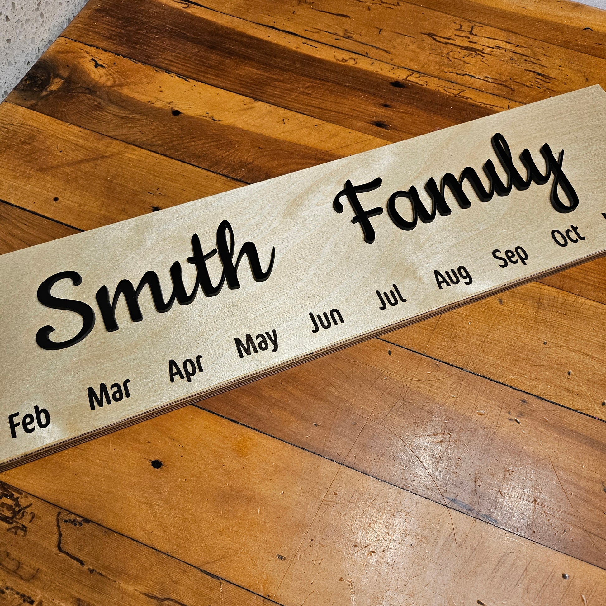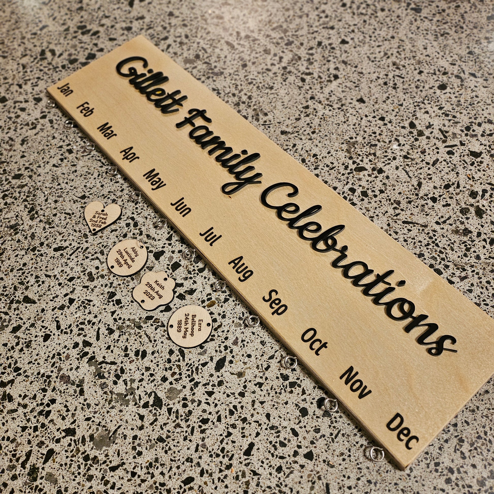 Crafted with a warm wooden backing, it features elegant black acrylic saying for your personal touch – choose "Family Celebrations," "Our Family Name," or something uniquely yours. The months are laser engraved with precision, creating a stylish and easy-to-read display.