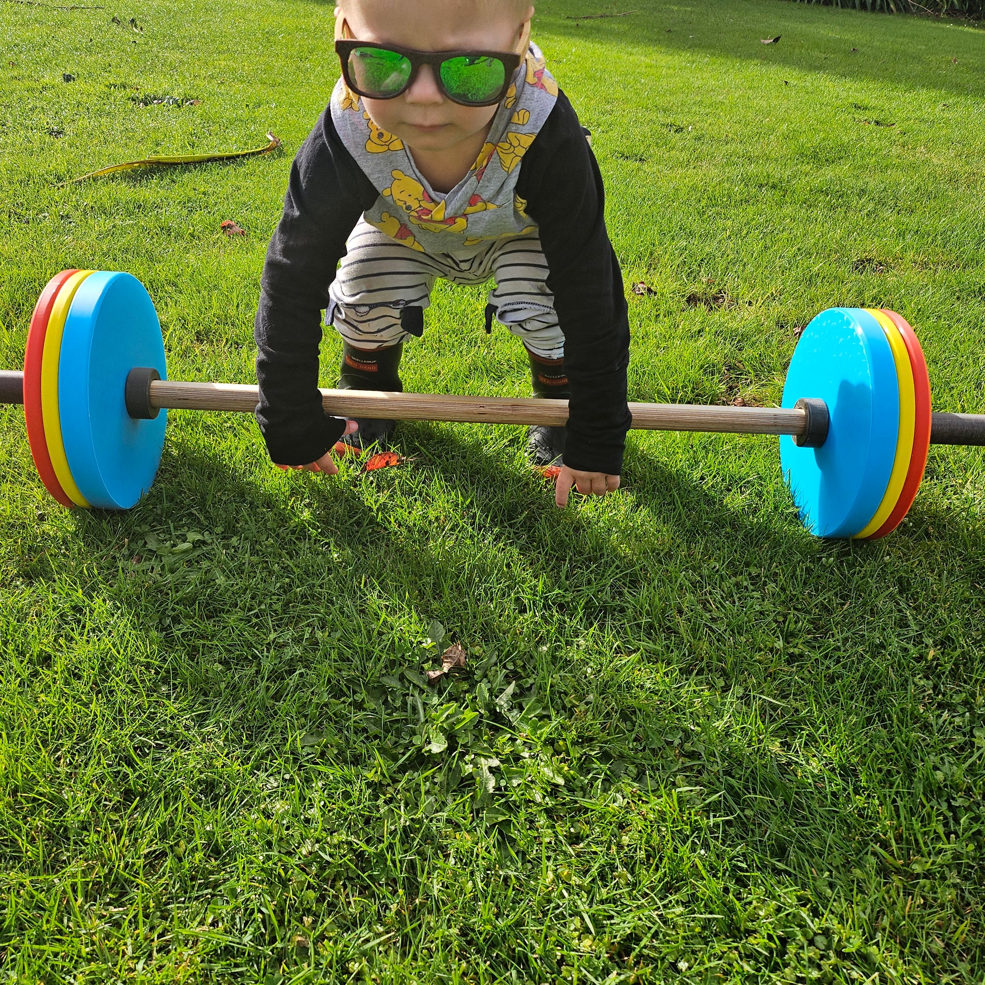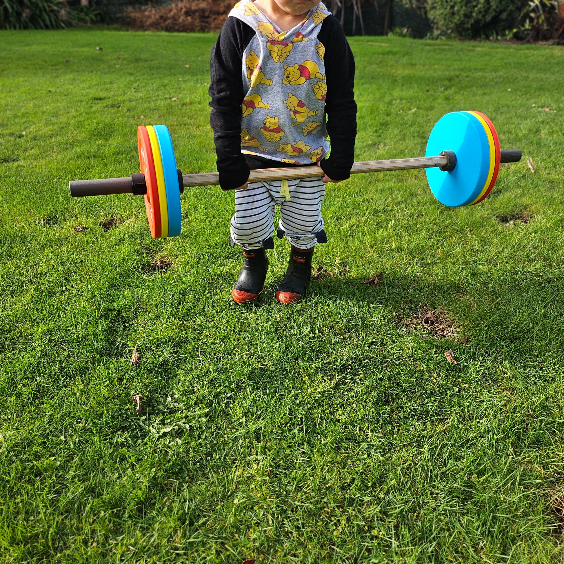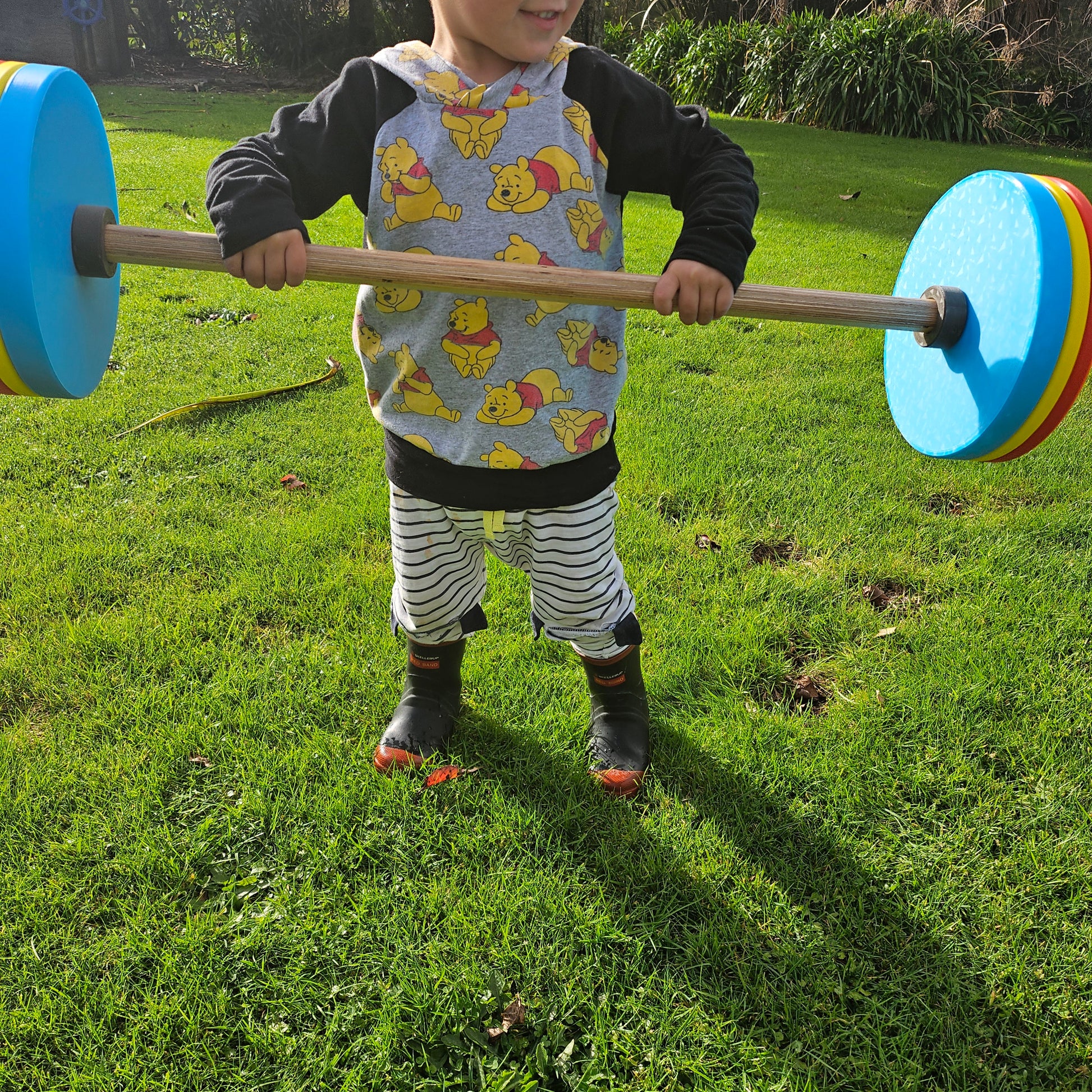Get ready for endless hours of pretend play, strength training, and active fun with this unique and engaging wooden barbell set!