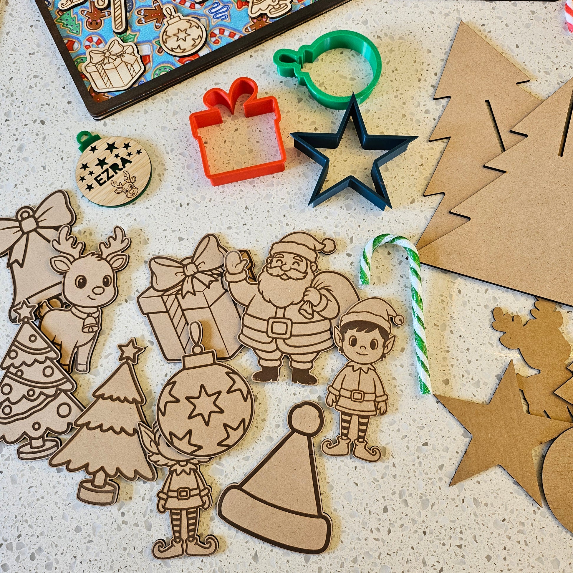 Puzzle Bundle includes:Personalised Santa Board, Personalised Bauble ornament, Personalised DIY Baubles (both sizes), Christmas Playdough roller, 3 Christmas Playdough cutters, Christmas Countdown Board, 15 Christmas Cardboard cutouts, 10 MDF Laser etched themed Christmas items, DIY Christmas tree and Christmas Puzzle.
