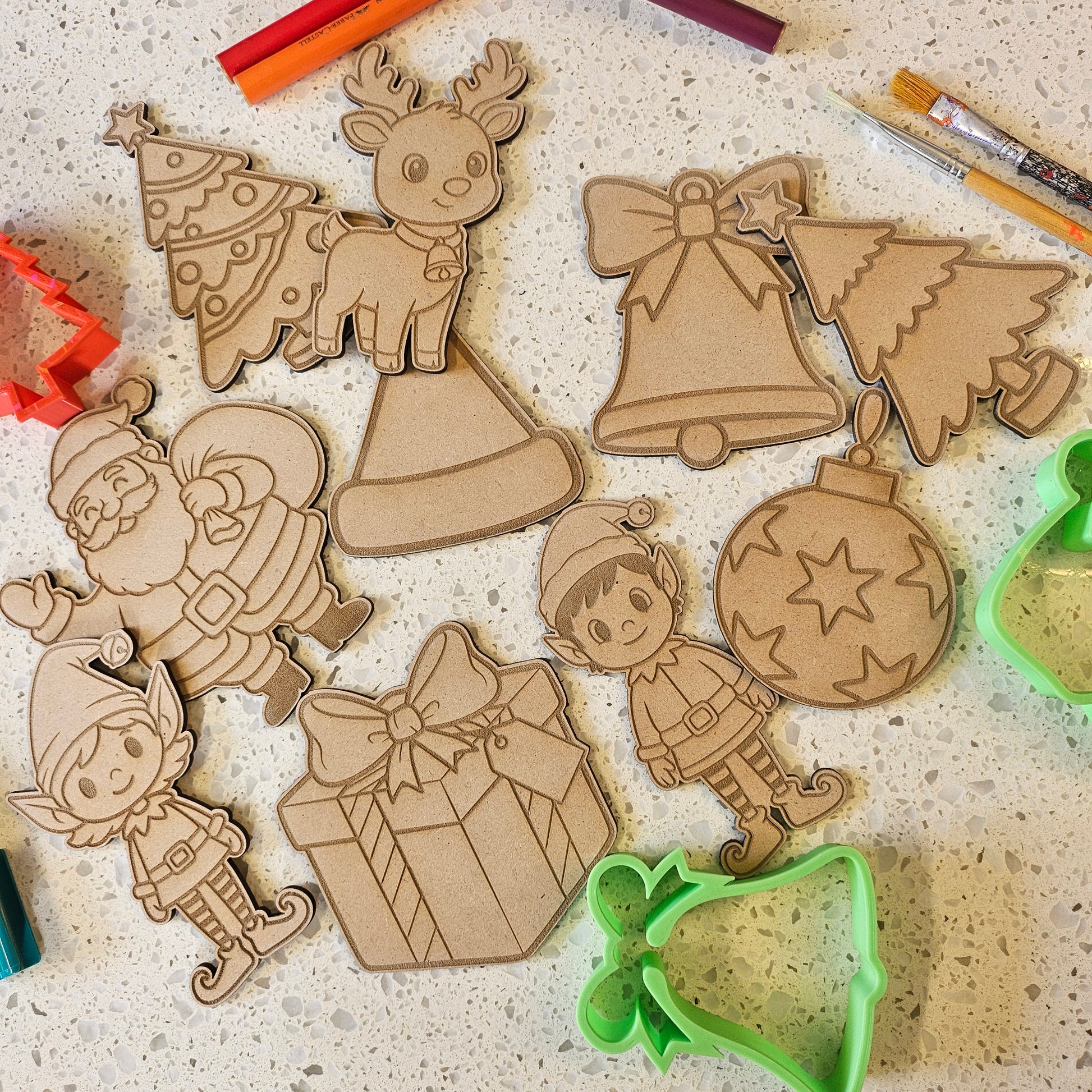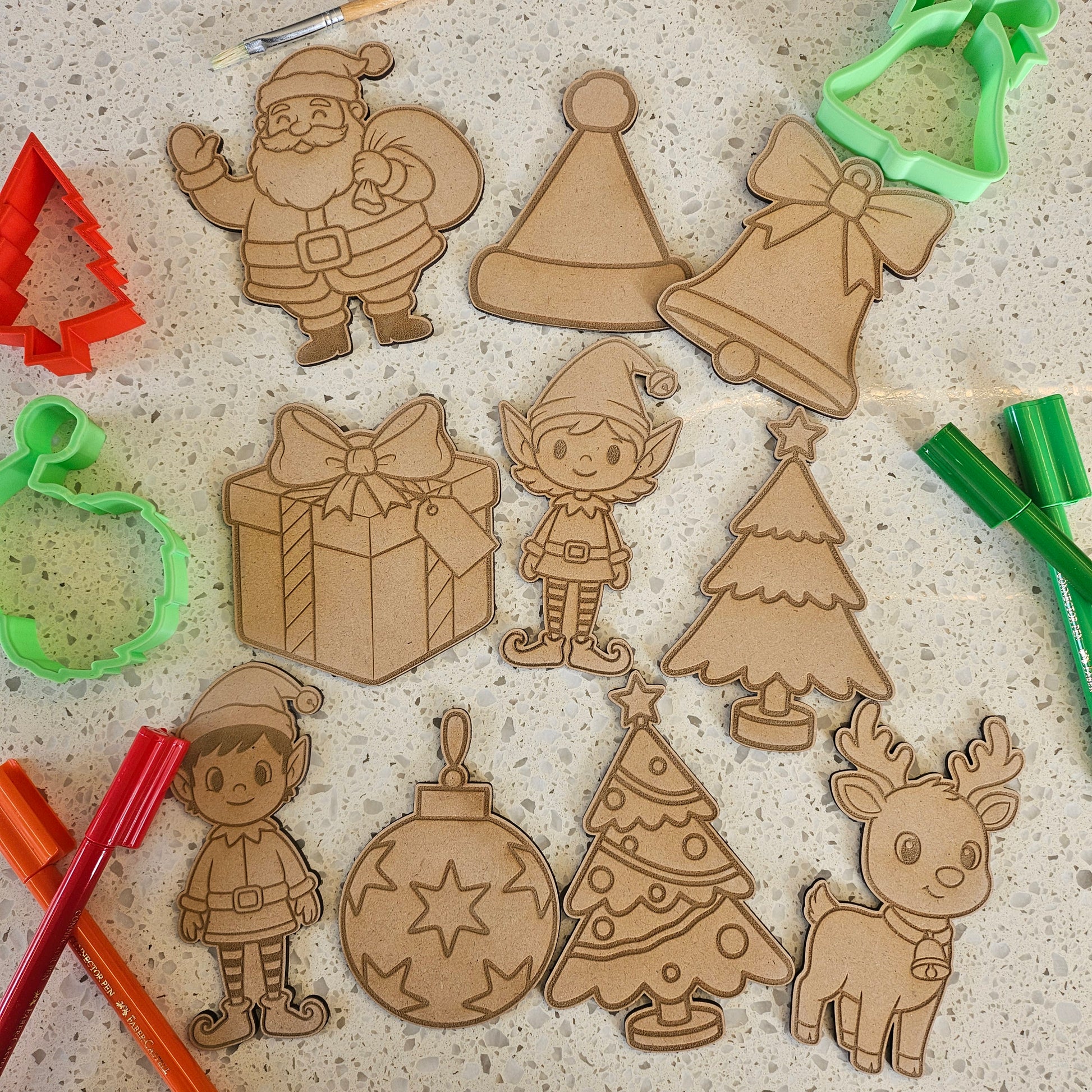 3mm thick MDF- Comes with 10 items: Elf 2 different designs. tree 2 different designs, reindeer, hat, present, stocking, Santa, bell, babble.