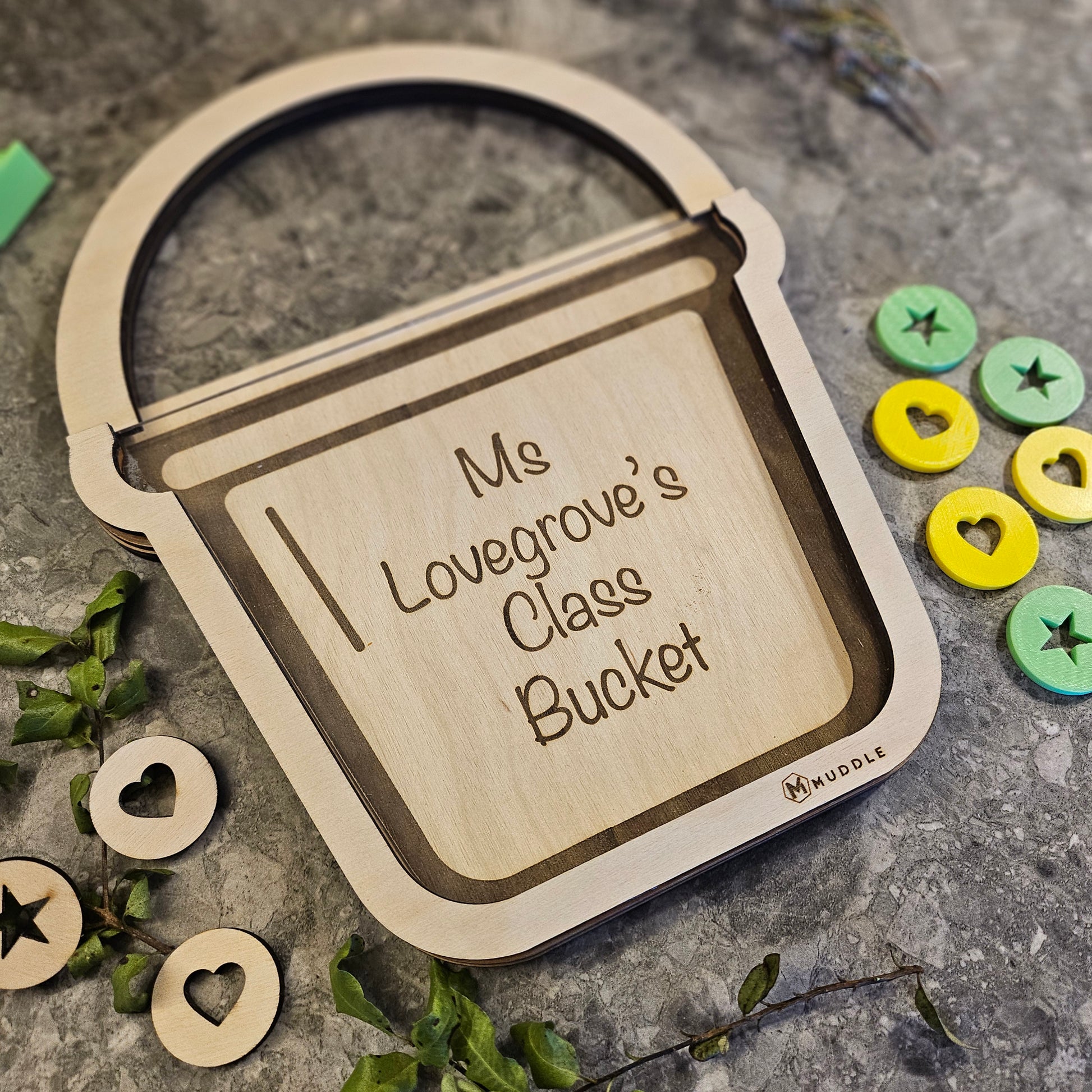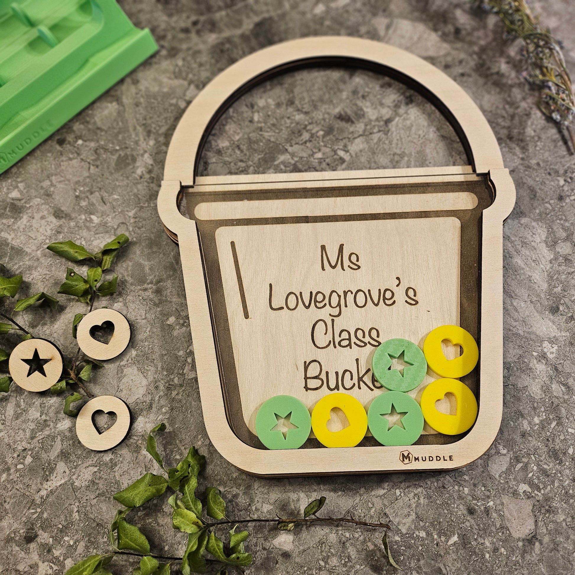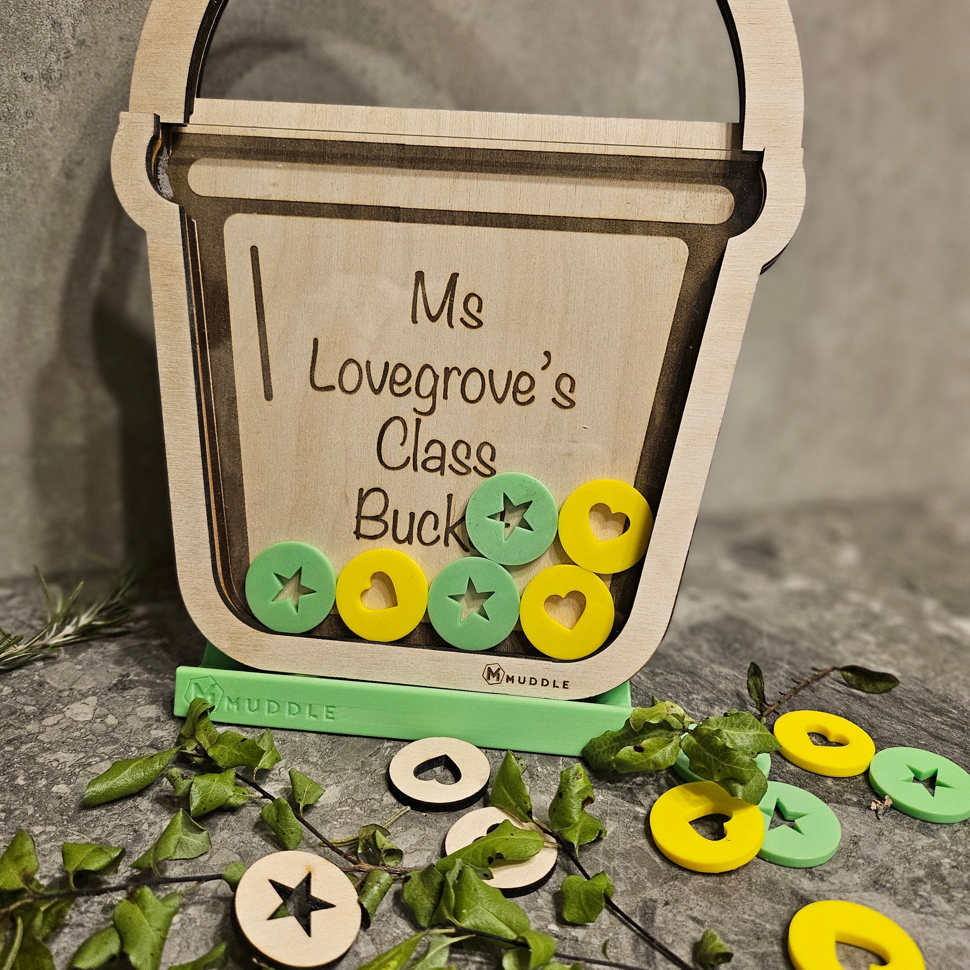 Encourage kindness and positivity in your classroom with this playful Class Bucket, inspired by the beloved book "Have You Filled a Bucket Today?" Customize it with your classroom’s name or any message you like. The set includes a 3D-printed stand for neat storage of the bucket and 30 tokens, available in wood or your choice of colourful 3D-printed tokens—perfect for rewarding thoughtful behaviour and filling hearts every day!