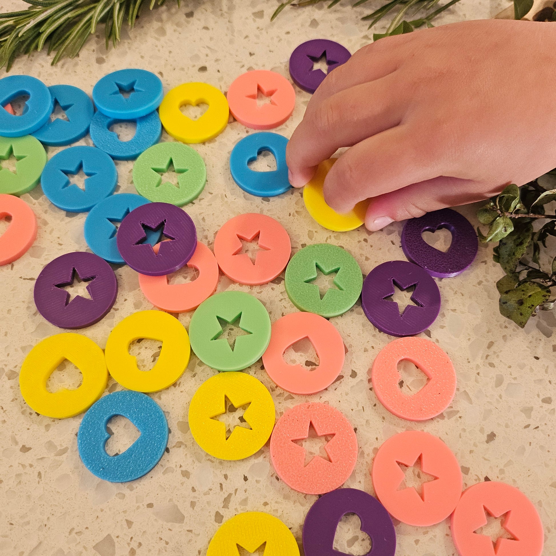 30 tokens (15 hearts, 15 star shaped) choice of colour of stand and 3D printed tokens if chosen are as follows please let us know what colour you would like in the notes section. Red, Yellow, Purple, Light Green, Green, Blue, Light Blue, Pink and Orange.