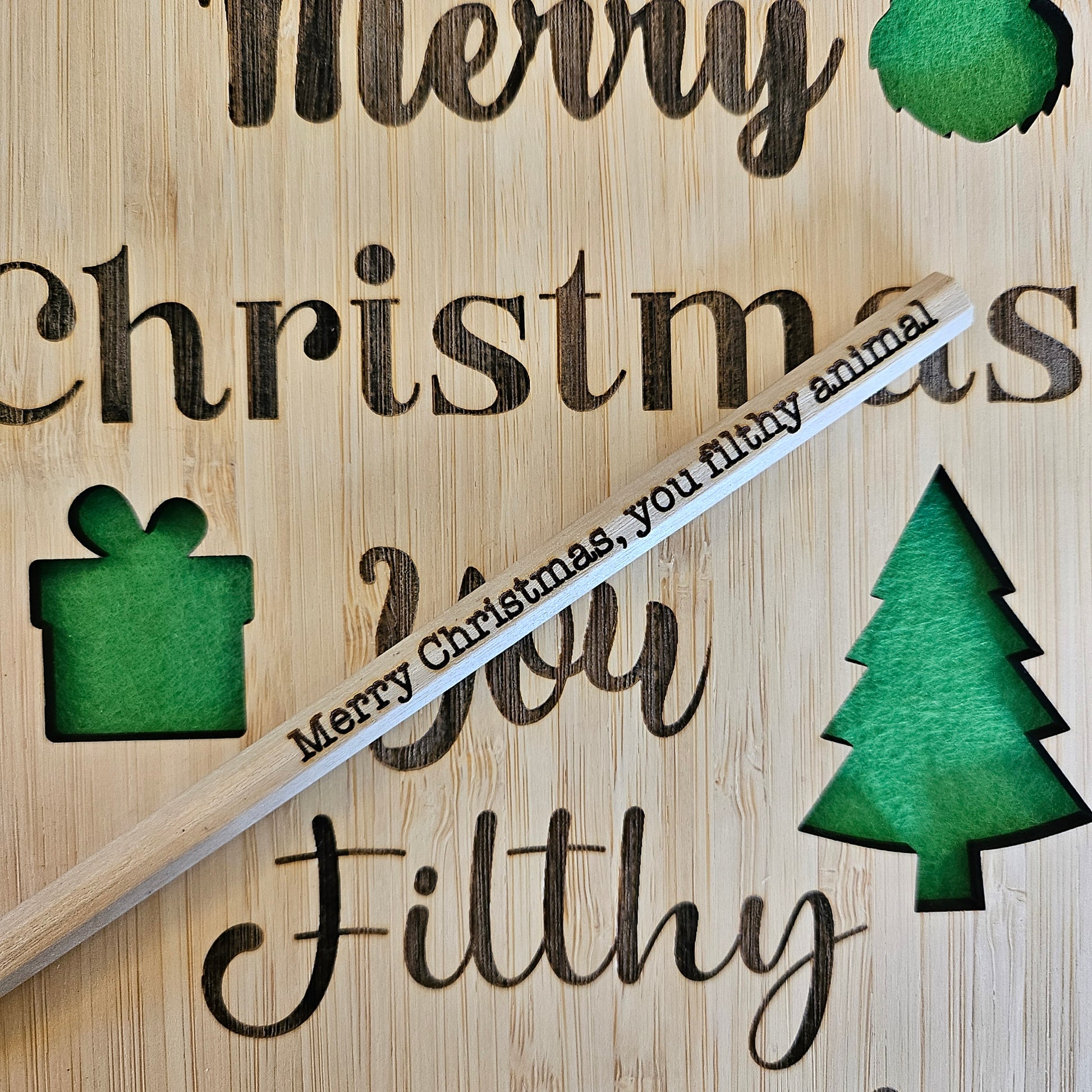 Spread some cheeky festive cheer with this playful wooden notebook set. Featuring laser-etched "Merry Christmas You Filthy Animals" on the cover, it's perfect for the irreverent holiday lover. Choose your own coloured felt to peek through the Christmas-themed cutouts, creating a personalised look. The matching wooden pencil arrives with the same witty etching, making note-taking mischievously fun. Packed with blank pages ready for your thoughts, lists, or doodles, this quirky duo makes a memorable gift for anyone who appreciates humour with their stationery.
