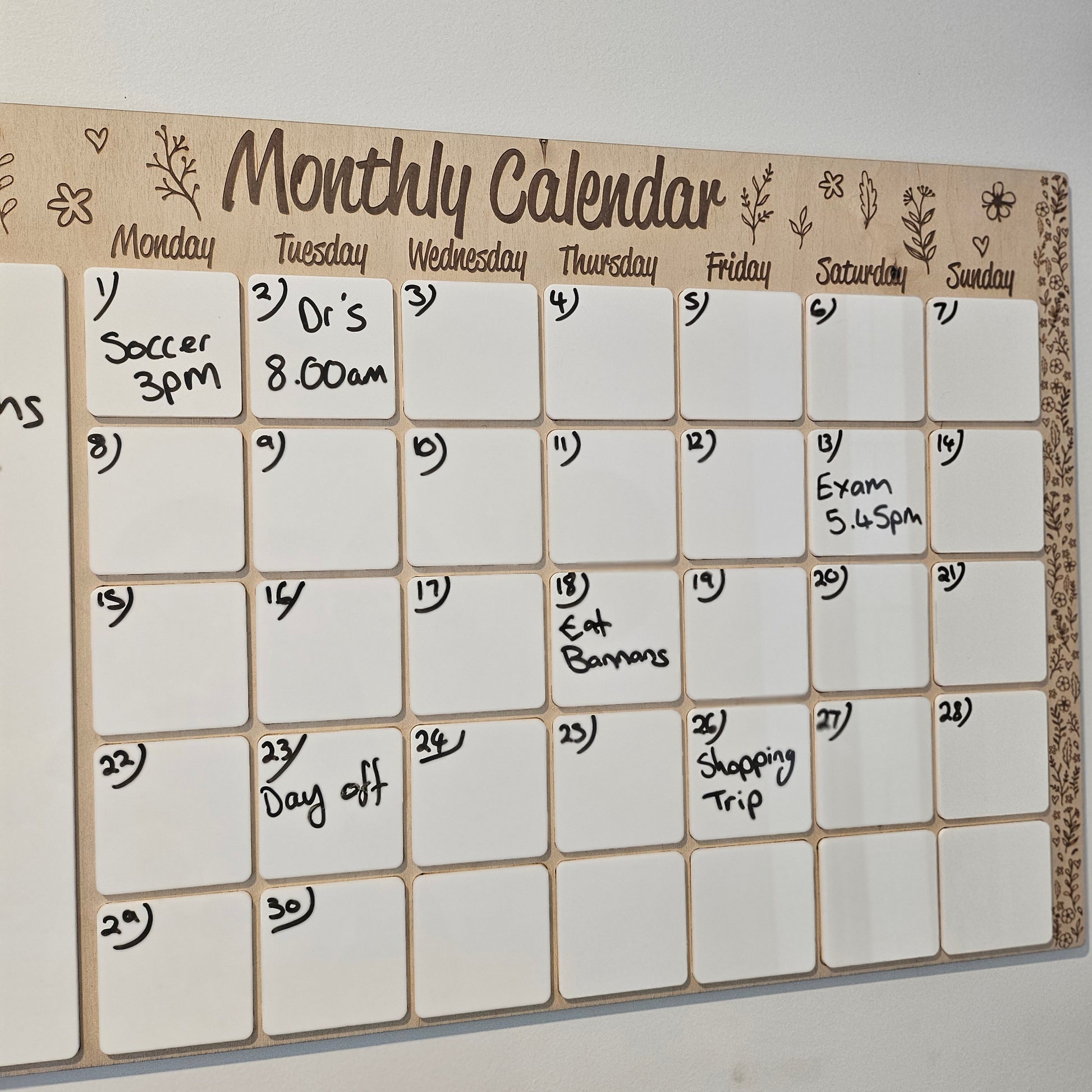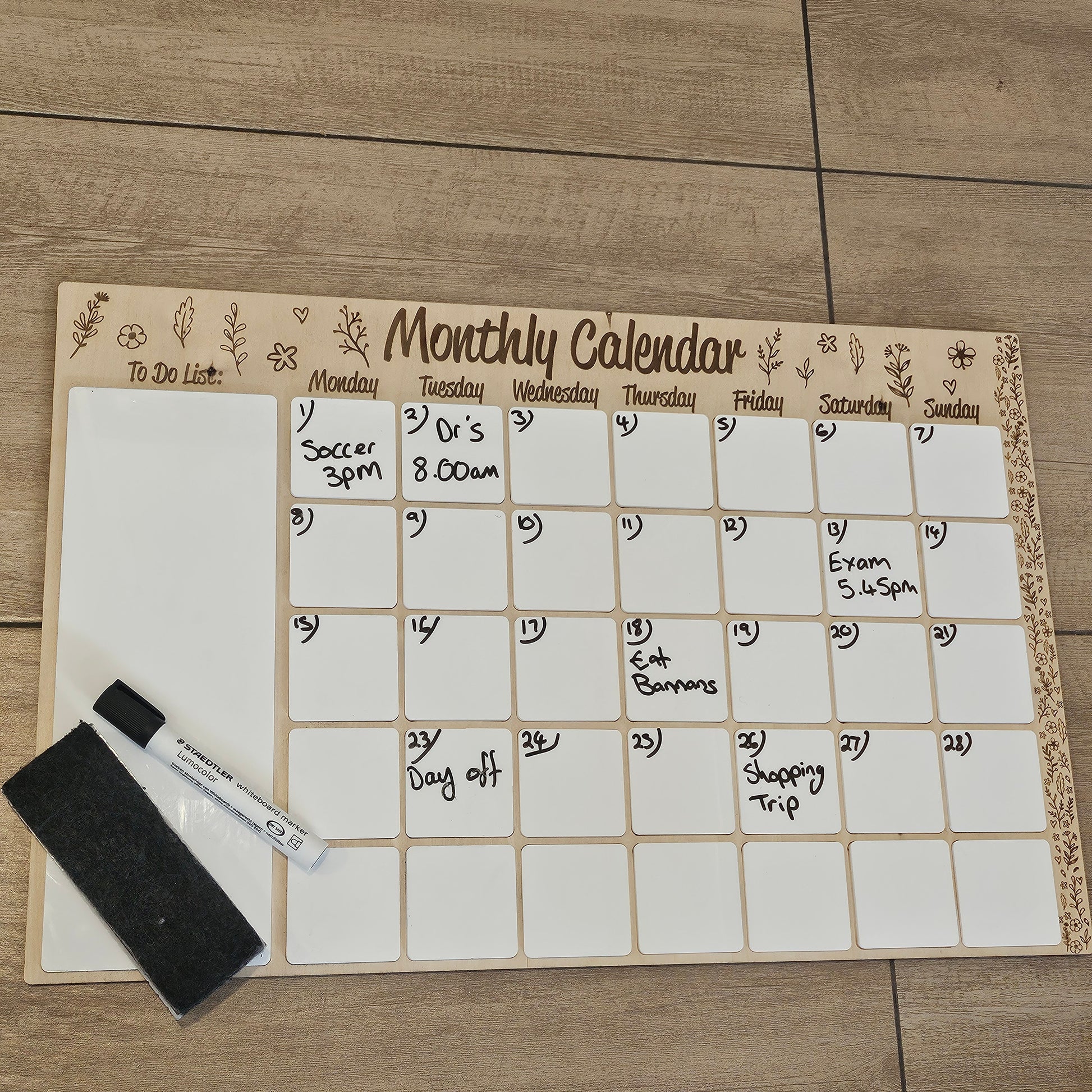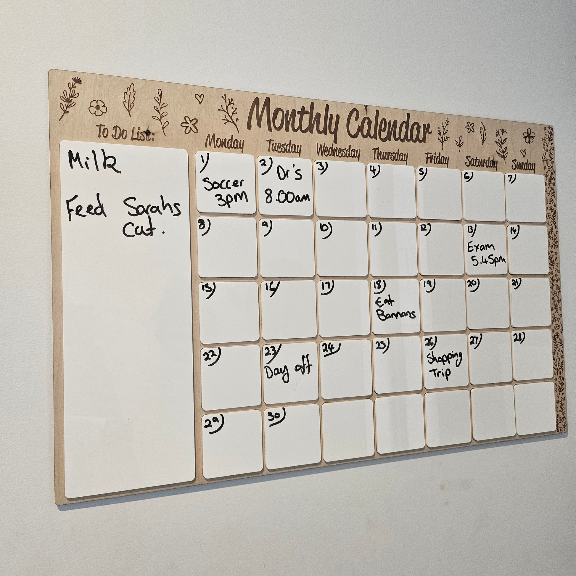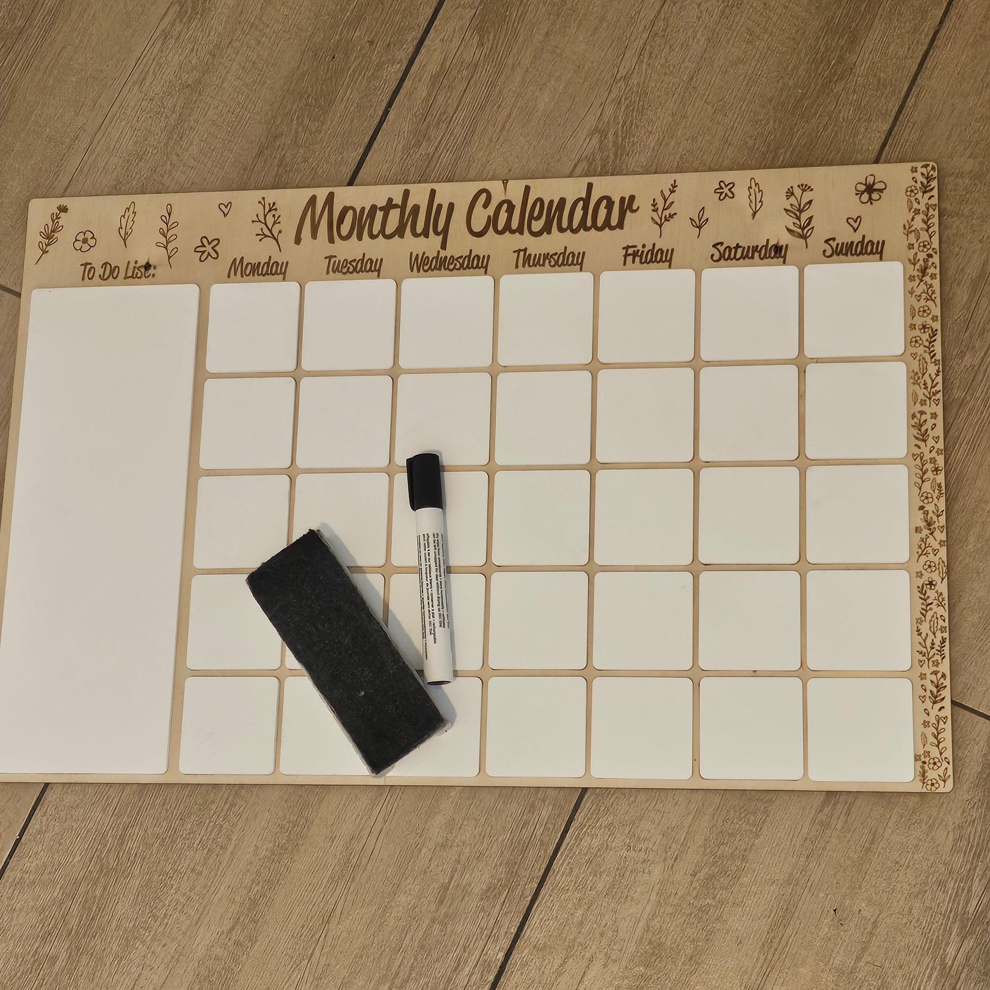 Stay organised with our wooden monthly calendar, featuring a fun floral pattern. The white acrylic dry erase squares allow you to easily write, erase, and rewrite your monthly schedule. Plus, it includes a handy to-do list for all your important tasks. Stay on top of every month, every year!