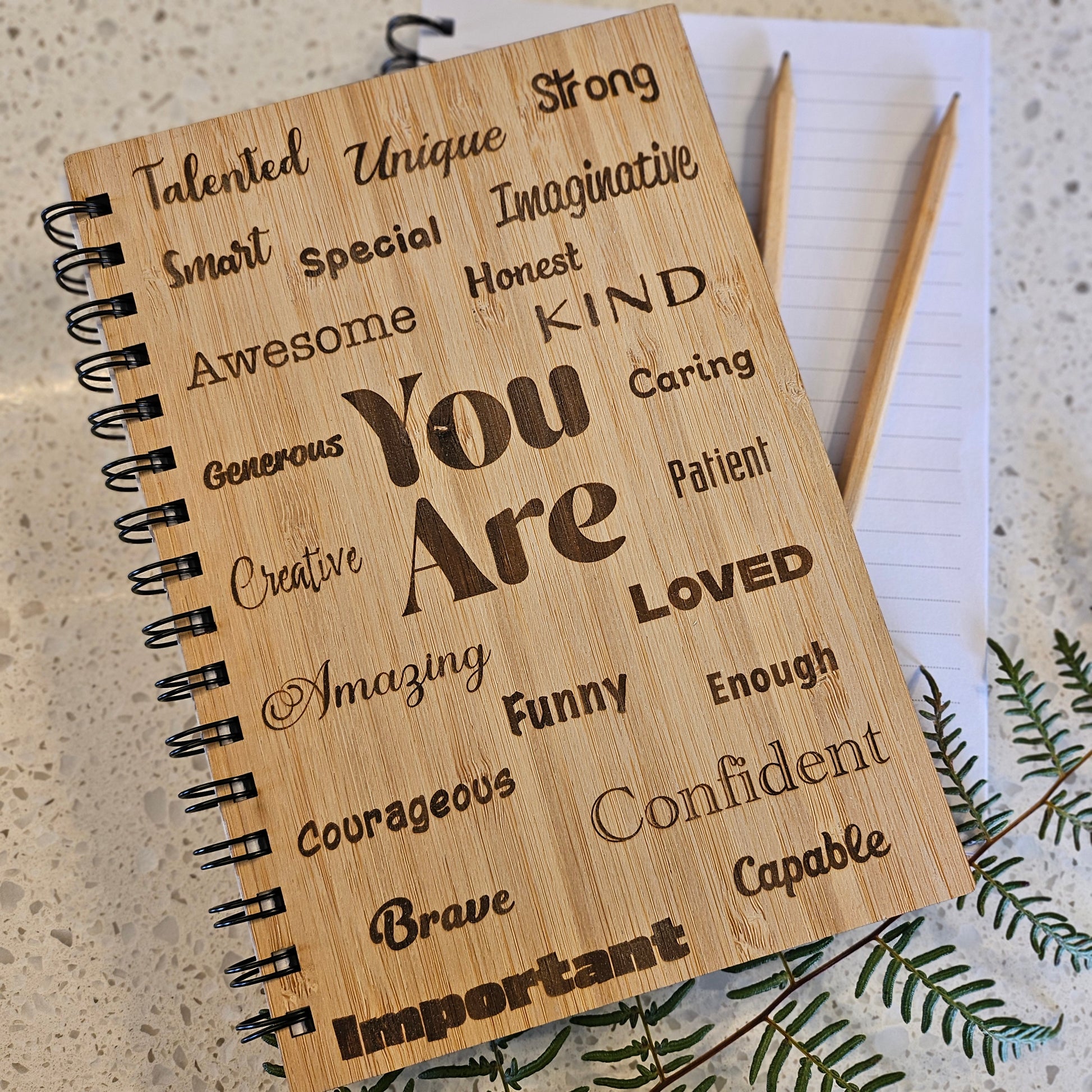 This playful wooden notebook features a laser-etched design with bold words "you are" surrounded by uplifting affirmations. Crafted with a bamboo cover, it’s perfect for jotting down your thoughts or daily reminders while keeping positivity close at hand. A charming and inspiring companion for your creative moments.