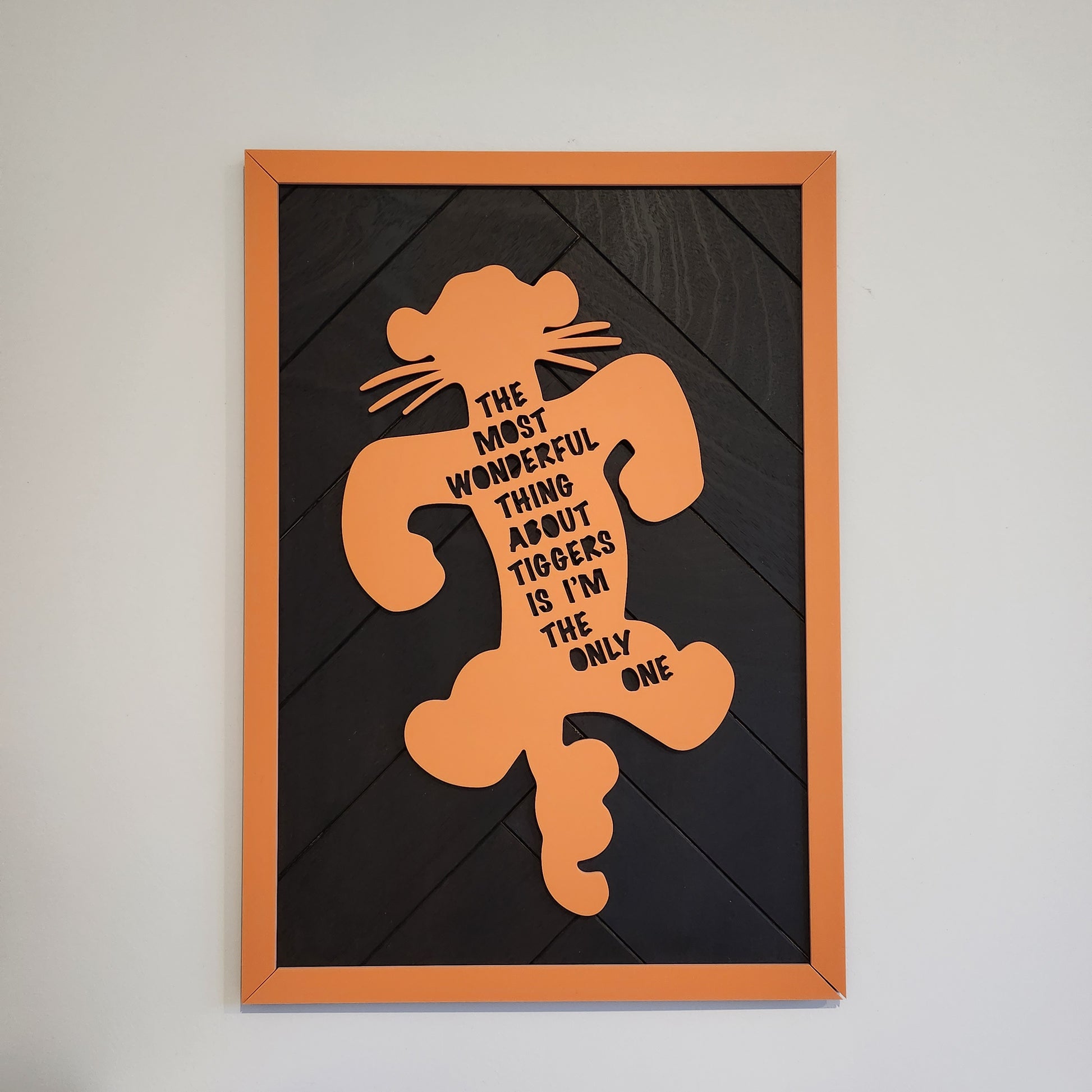 Make your home feel like the Hundred Acre Wood with this whimsical Tigger Wall Hanging. With it's vibrant colors, wooden herringbone background, and Tigger silhouette, it's sure to bring a smile to your face! Hang it up in your child's room (or yours!) for a delightful touch of 'TTFN' (Ta-Ta For Now)