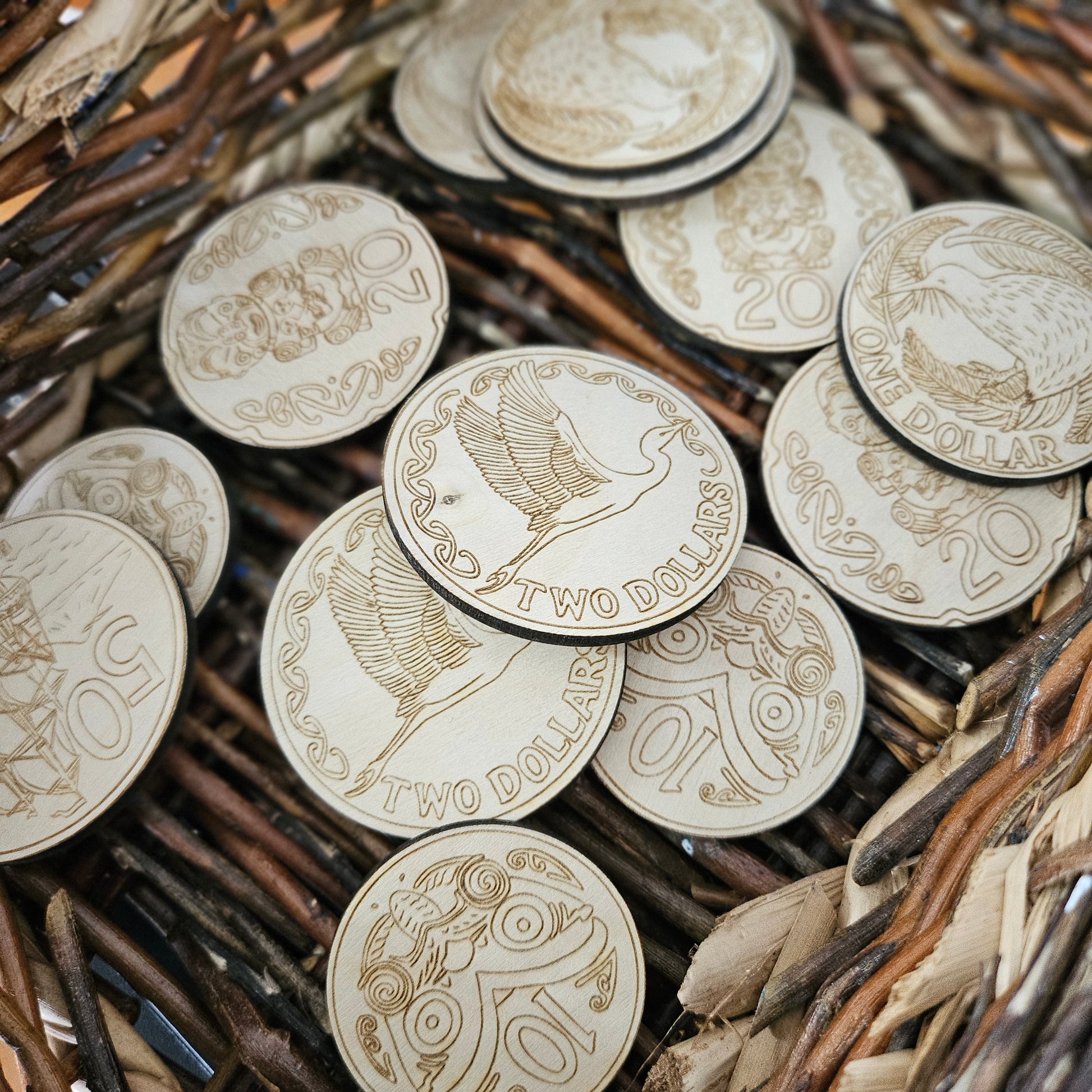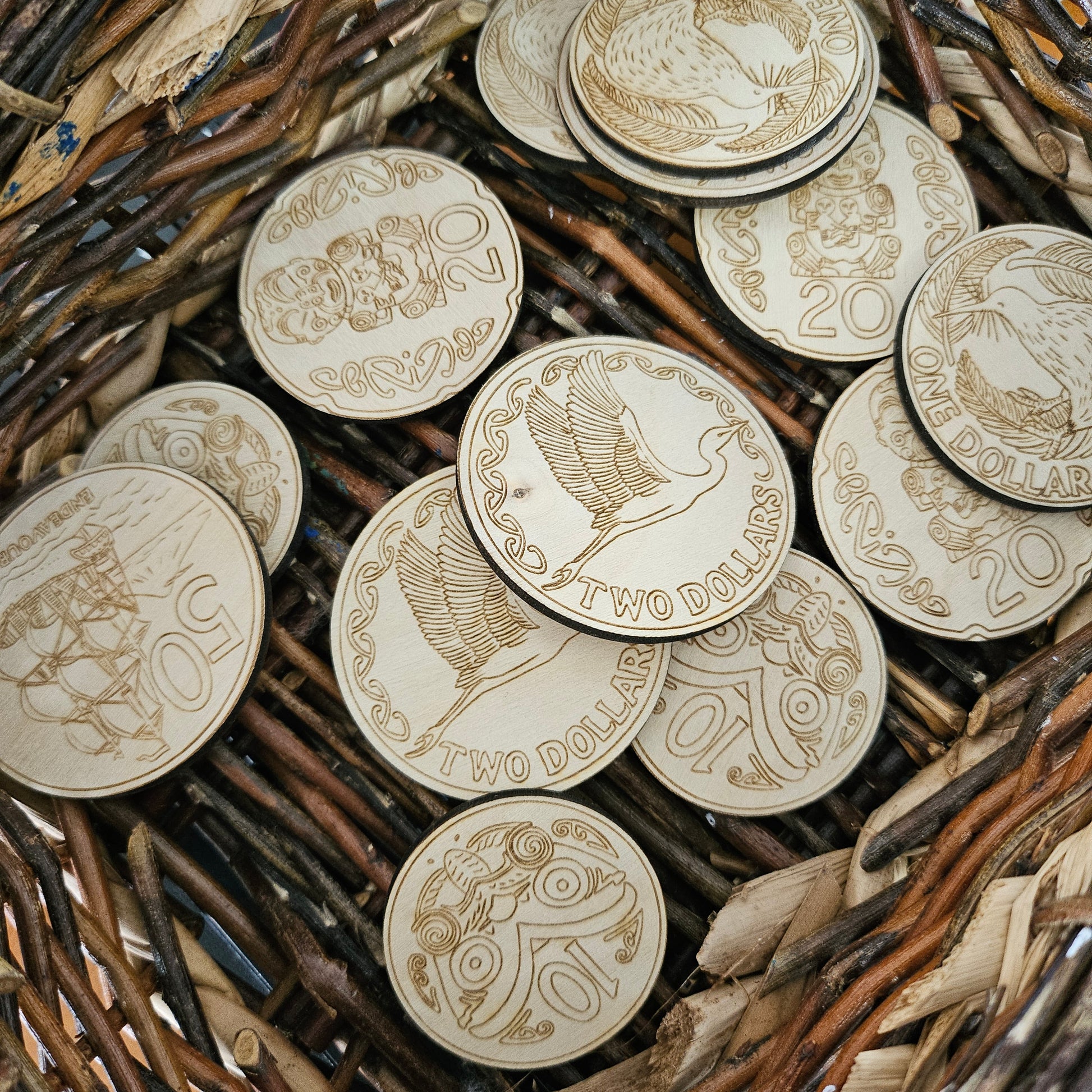 Get your hands on these quirky Wooden Play Money NZ Coins! Inspired by New Zealand, these double-sided coins (10, 20, and 50c, 1 and 2 dollars) are made from either MDF or birch wood and laser-etched for durability. Available in two sizes - accurate size to real coins or enlarged for easier to play with, you can now play with style and authenticity!